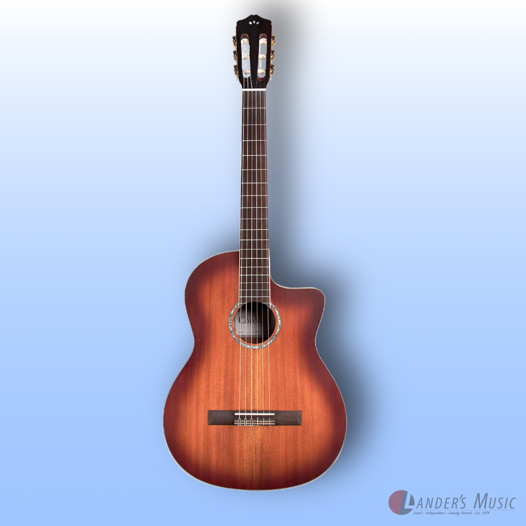 The C4-CE's solid African Mahogany top provides a crisp, articulate tone, combined with African Mahogany back and sides for balanced volume and sustain. The construction is based upon our traditional Spanish classical guitar, with the inclusion of a soft cutaway and a slightly thinner 50mm-width neck designed for comfortable playability and easy upper-register reach. Premium design elements such as a Maple binding, Abalone rosette, and a striking Edgeburst finish will help you stand out from the crowd. The Fishman Presys VT Pickup System produces a rich and natural sound when amplified, and puts the soundhole-mounted controls at your fingertips - perfect for gigging and recording.